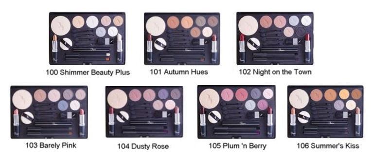 Cada paleta de cor contém: 1 Pó Compacto Translúcido, 2 Blushes, 1 Lápis de Olhos, 4 Sombras, 1 Rímel ou Fixador de Sobrancelhas, 1 Lápis de Lábios e 2 Batons.